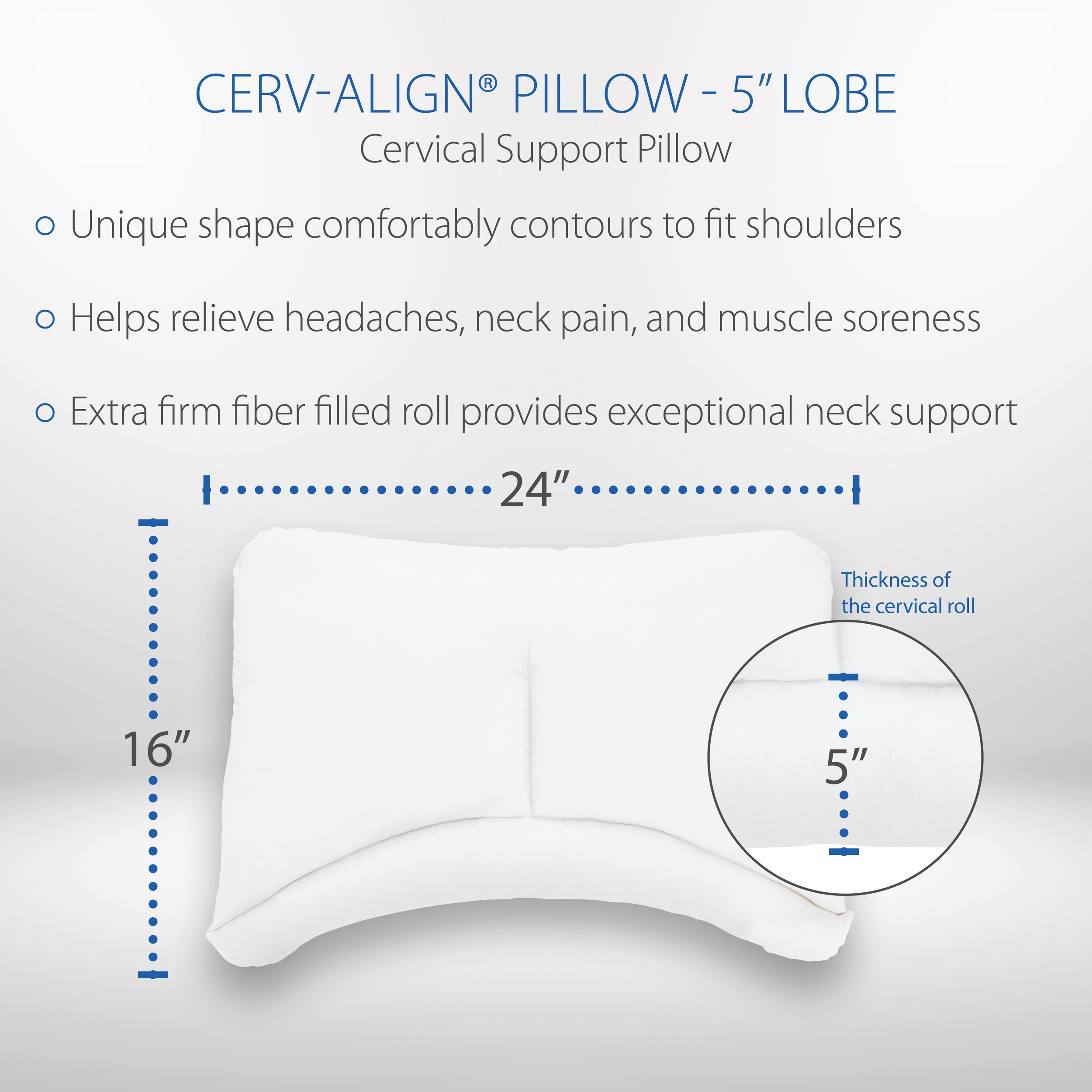 The Cerv-Align Cervical Support Pillow has both the firm support of an orthopedic pillow, and the comfort of a traditional sleeping pillow. Designed to help relieve headaches, neck pain, and muscle soreness, this pillow is commonly used to help manage a variety of conditions affecting the neck and shoulders. While back sleeping, the extra firm fiber filled neck lobe contours to fit the shoulders and provides even support across the shoulder line while the conventional pillow area comfortably supports the head. For side sleepers or those who prefer the comfort of a traditional fiber or feather pillow, simply rotate the support lobe away from the neck. The fiber filled area gently cradles the head with down-like comfort and can be used to adjust to sleeping on the firm cervical lobe. It may take some time to adjust to this cervical pillow and immediate overuse may increase neck pain. Those who slowly ease their way into orthopedic correction by alternating between this pillow and their current pillow achieve the best results. Select from two different lobe sizes for a custom fit. Covered with high quality cotton fabric for maximum comfort and durability. The Cerv-Align's exclusive fitting system ensures a proper fit for any body type. Fits a standard pillowcase. Made in the USA and contains no latex.