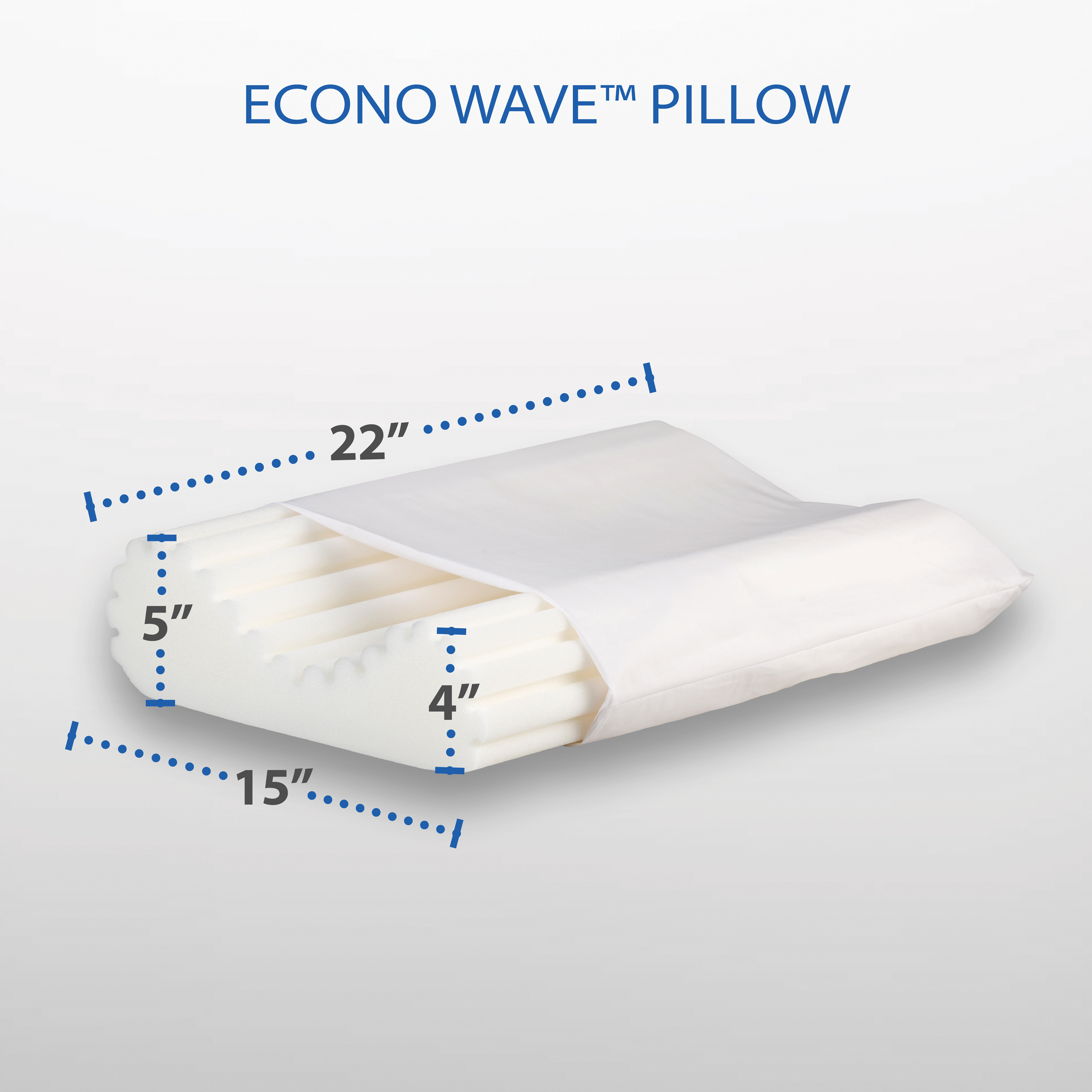 The Firm EconoWave Pillow features a wave shaped surface which provides even support and allows air to circulate for increased comfort while you sleep. Designed to help alleviate headaches and neck pain, this pillow helps gently support the natural curve of the neck while sleeping on your back. Two different sized lobes provide different support options. Use the larger neck lobe for maximum support or the smaller neck lobe if you are in the adjustment phase or if you prefer slightly less support. It may take some time to adjust to this cervical pillow and immediate overuse may increase neck pain. Those who slowly ease their way into orthopedic correction by alternating between this pillow and their current pillow achieve the best results. A washable cotton/polyester cover is included; pillow conveniently fits into your favorite standard pillowcase. Pillow measures: 22 x 15 inches with 4 1/8 inch and 4 7/8 inch lobes. Made in USA and contains no latex.