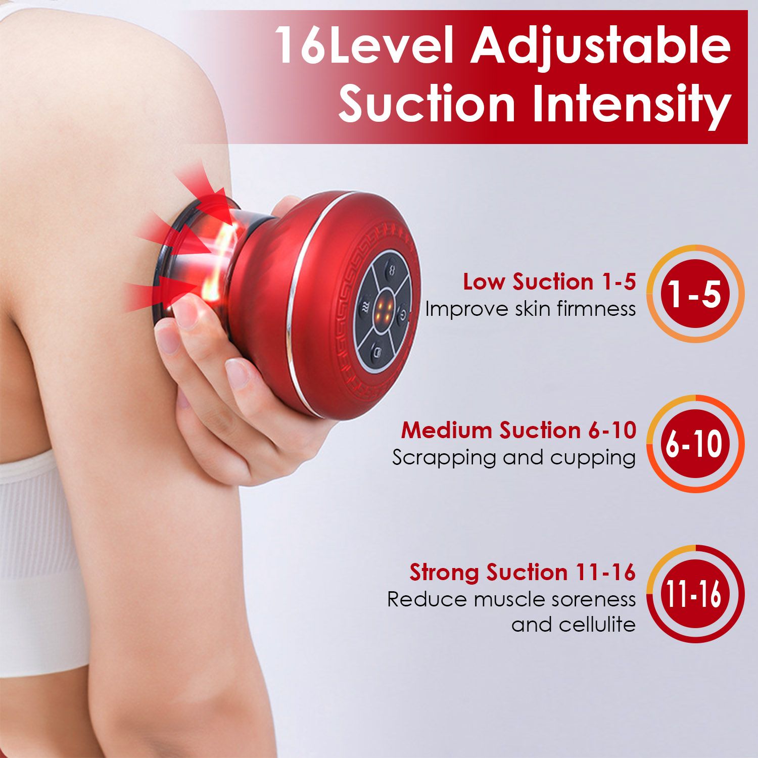 *16-Level Temperature & Suction*: Comes with 16 levels of red light heating therapy and suction pressure; you can choose the desired level according to personal demands. Up to 113°F temperature work great on breaking down the excess lactic acid in the muscles and promoting blood circulation. Additionally, the deep negative pressure mode is aimed at people after intense training, while the smooth breathing mode helps relieve body fatigue by rhythmical and continuous suction and release.