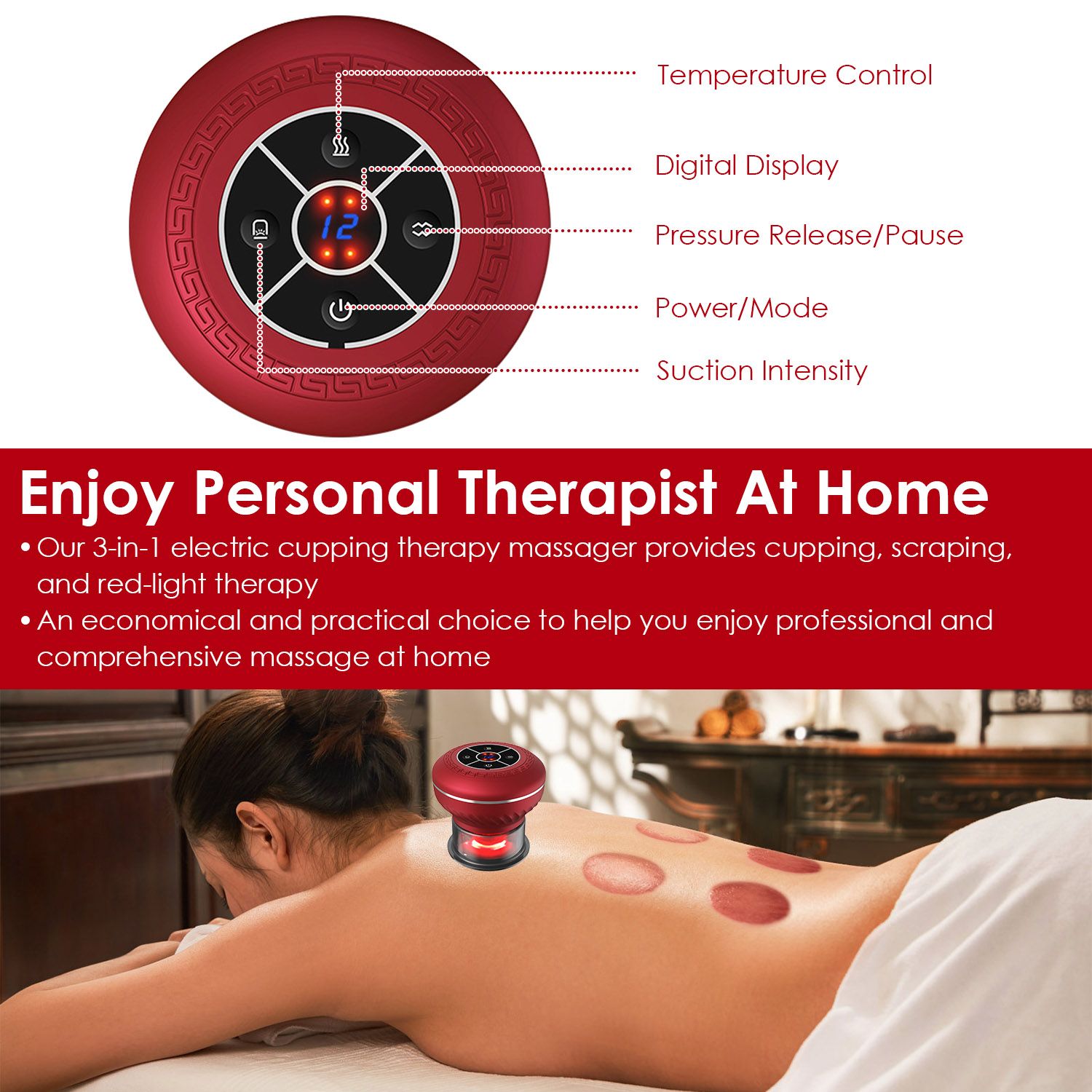 *3 1 Cupping Therapy Set*:Combined with cupping, scraping, and red-light therapy, our 3-in-1 electric cupping therapy massager is an economical and practical choice to help you enjoy professional and comprehensive massage at home. Suitable to be used on your back, shoulders, neck, legs, abdomen, this cupping therapy device is designed to effectively alleviate pain, improve skin firmness, reduce muscle soreness and cellulite, and accelerate post-exercise recovery.