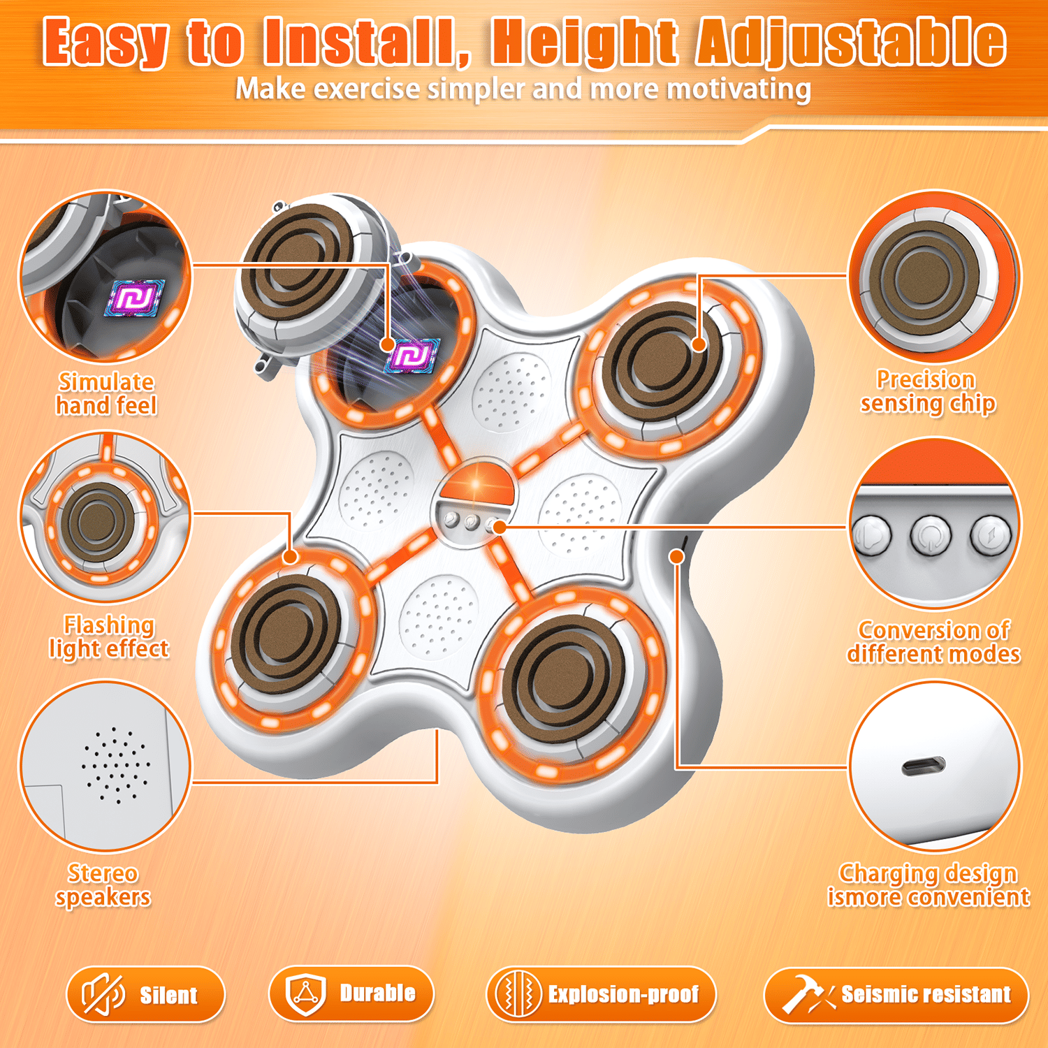 The four glowing keys light up as kids strike, turning exercise into an exciting interactive activity. Soft EVA padding absorbs impact safely, making it ideal for small hands while supporting motor skill development and promoting healthy physical activity. The bright white body with orange LED accents gives it a cheerful, kid-friendly appearance that suits playrooms, bedrooms, and early childhood learning spaces perfectly.