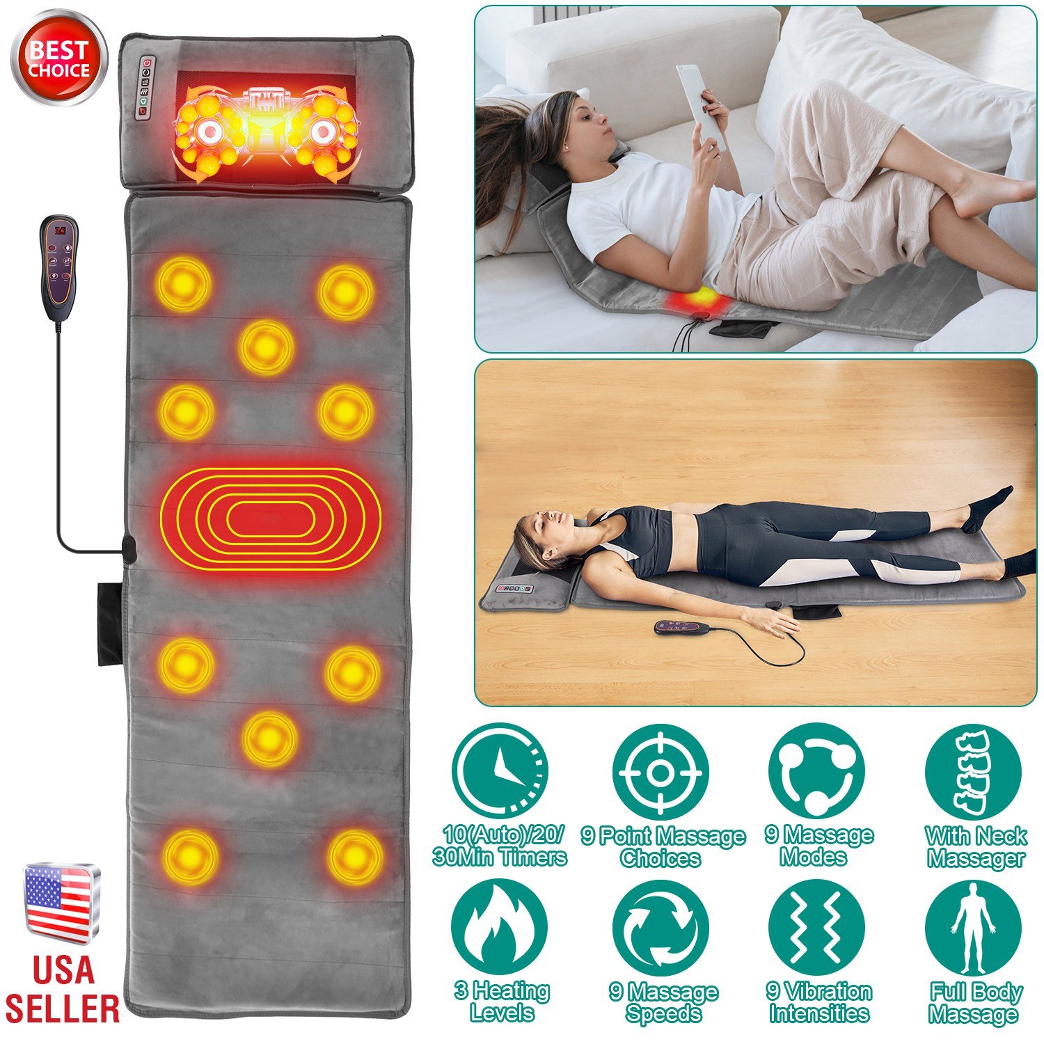 *Full Body Massage Mat*:Our massage mat features 10 massage points including Back,Buttock,Waist,Thigh,Calf,and heating therapy function,it's able to give you a therapeutic massage that helps release tension, stress, and fatigue after a long work day. You can choose 9 designated vibration modes, 9 point-selection vibration modes, and enjoy full control over 9-level vibration intensity and 9-level speeds as you hit all the right spots.