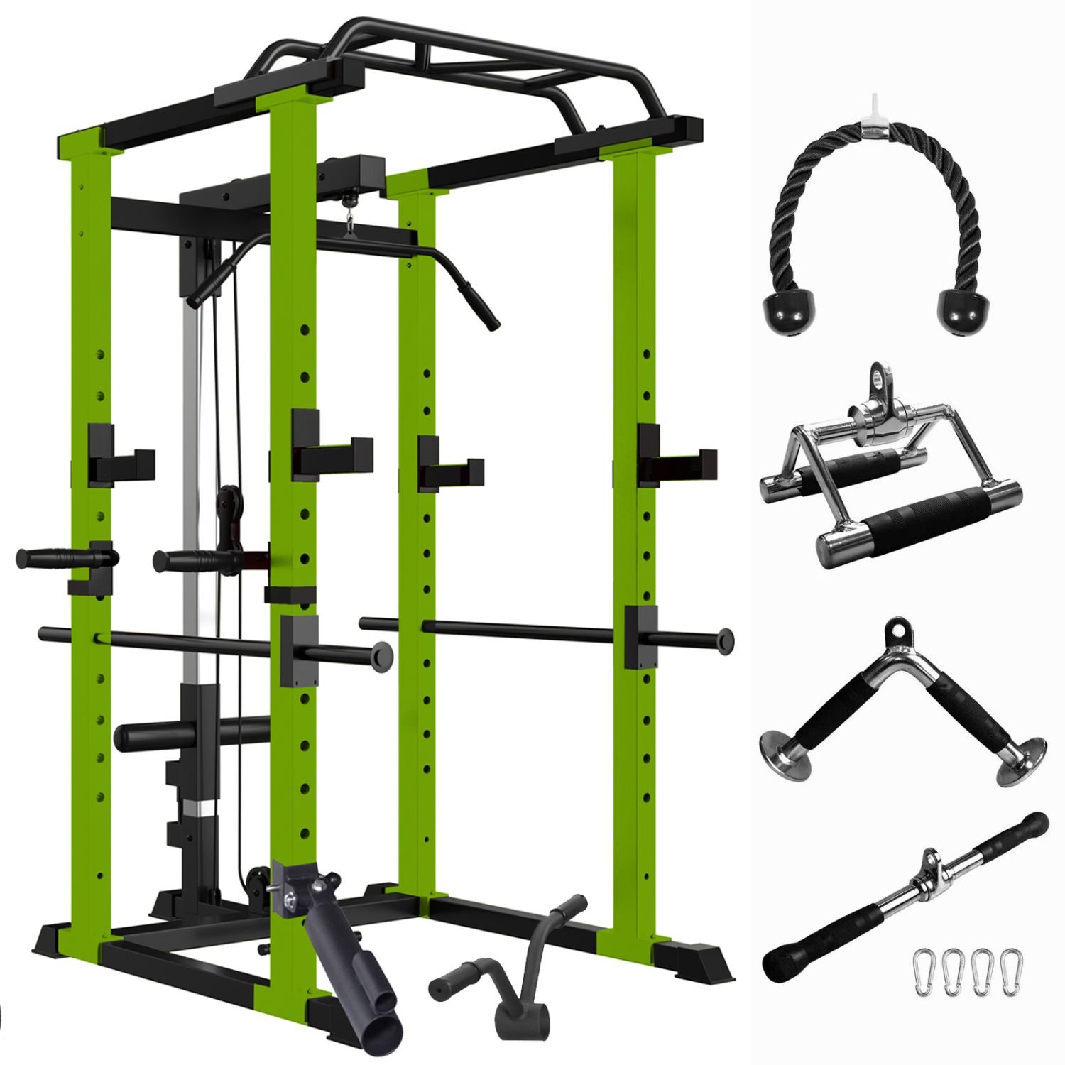 [4 Rubber Foot Support & Stable Reinforcement]The upgraded 4-foot support reinforces the stability of the weight cage power rack and protects the floor from scratches at the same time, not shake during strength training. Our product guarantees your exercise safety. The diameter of the pull-up bar and the two rear bars of the squat rack with lat pull down is suitable for installing the lat pull down on the market, which can unlock more workout actions.