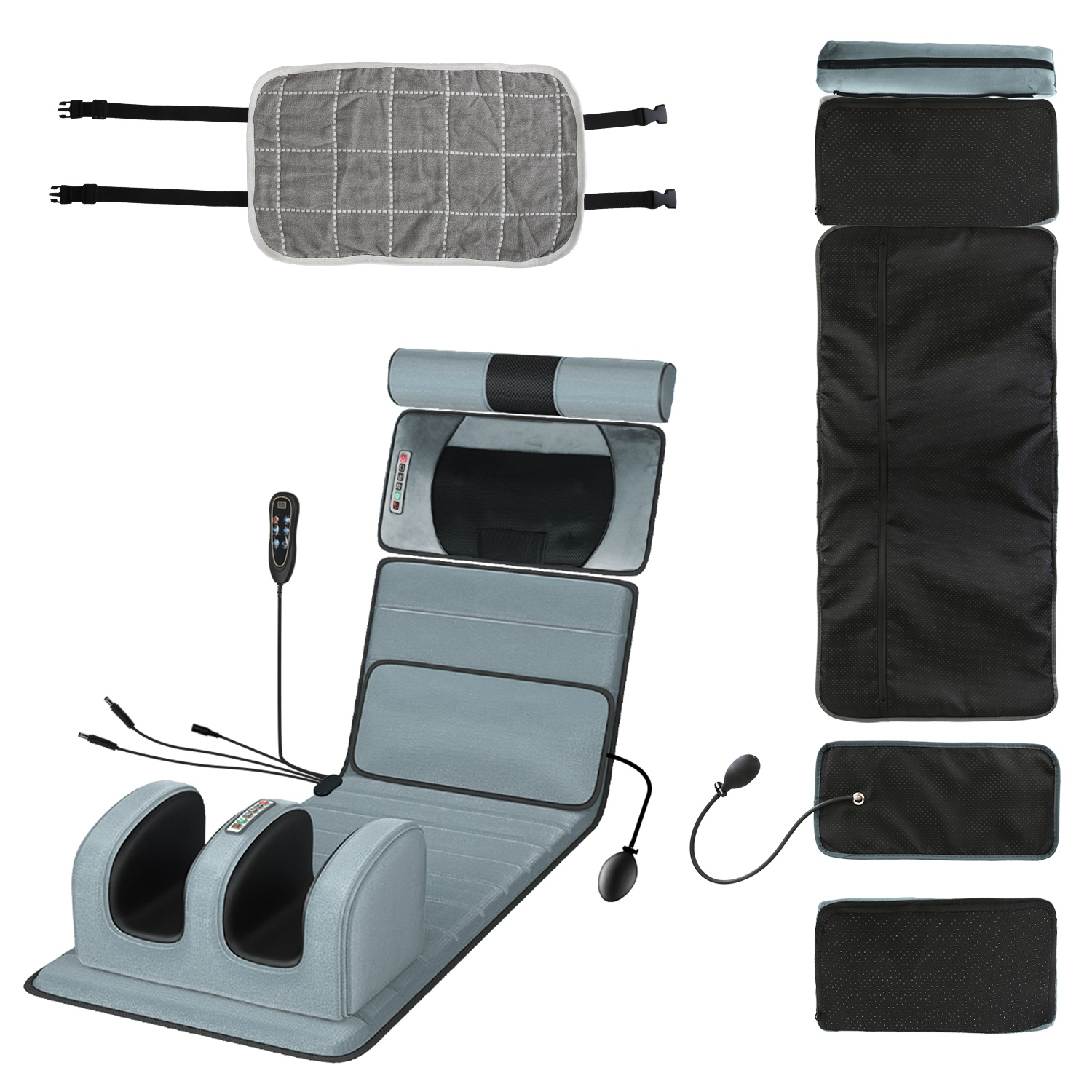 * The neck massage, foot massage, head pillow, and inflatable lumbar pillow can be used individually. Just zip off the zippers on the neck, massage, foot massage, and head pillow to detach it from the full body massage mat.