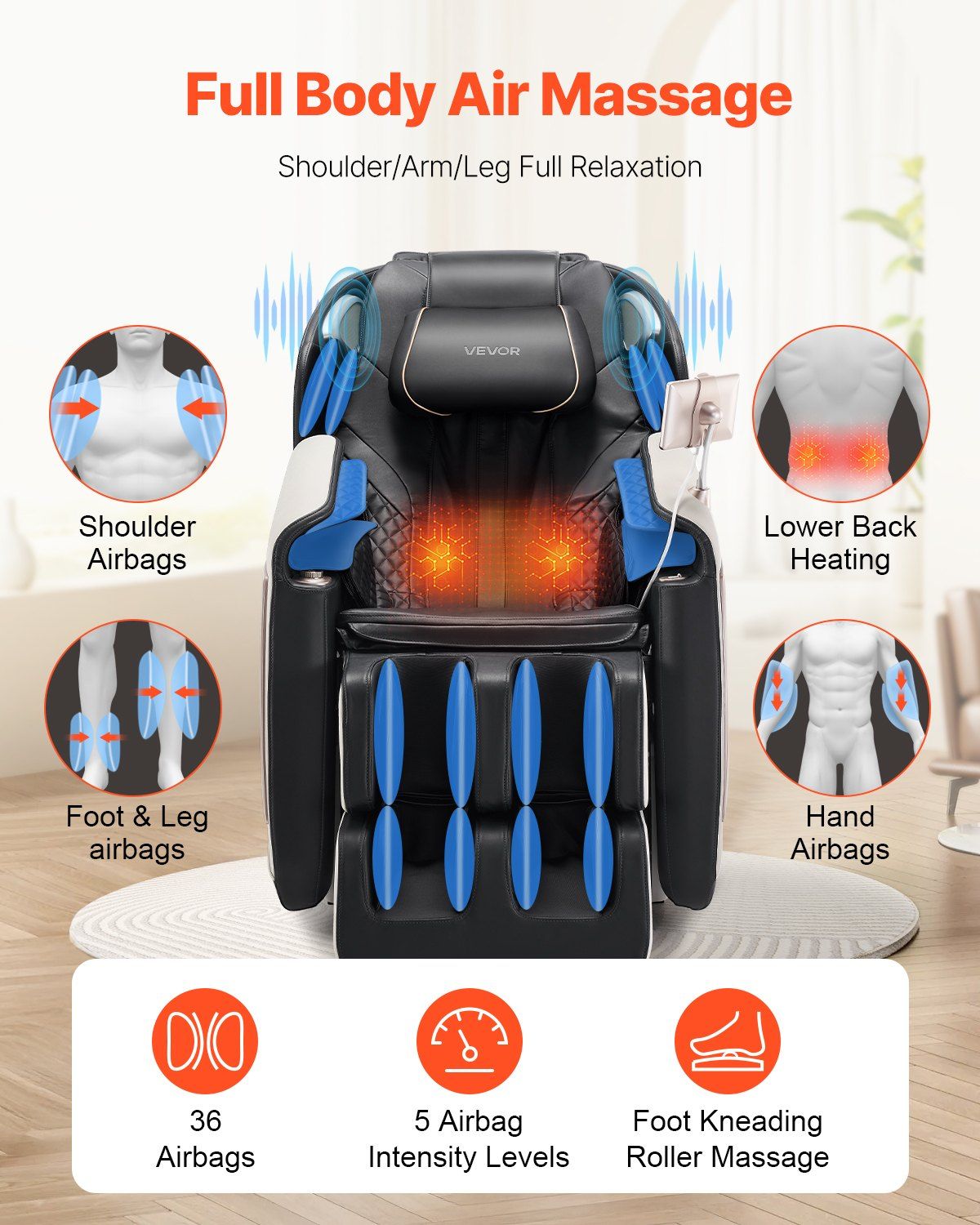 2.Full Body Coverage: The ergonomic SL track adjusts to your body, fitting users from 4.6 to 6.1 ft / 1.4 to 1.86 m. With 36 airbags and 5 adjustable levels, it provides a comprehensive massage experience.