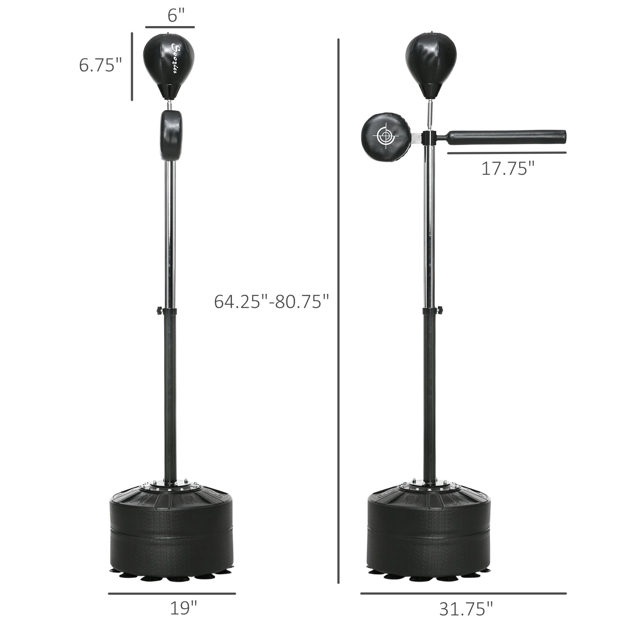 5.- Boxing Trainer Info: Overall Dimensions: 31.75" D x 19" W x 64.25" - 80.75" H. Speed Ball Size: 6'' Dia. x 6.75'' D. Loading Capacity of Base: 66 lbs. (Water), 77 lbs. (Sand), 88 lbs. (Sand / Water Mixture). Air pump included for assembly.