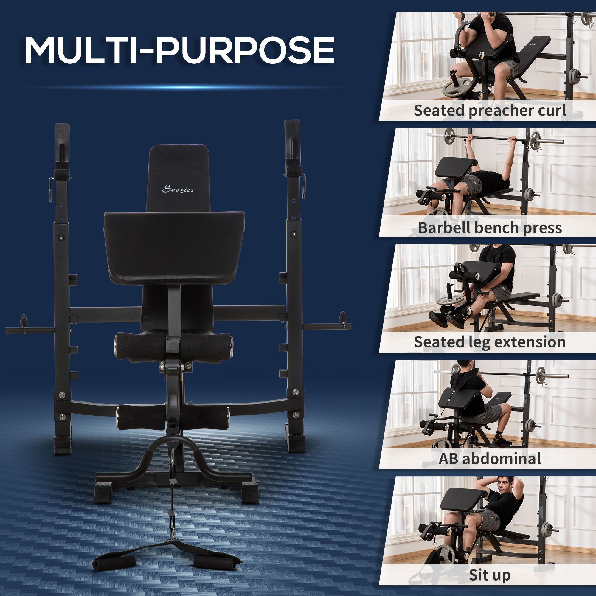 Build a complete strength station at home with this Weight Bench Stand with Squat Rack, Arm Curl Pad, and Leg Extension in grey. Designed as a multi-function Olympic bench, it supports upper and lower body training in one space-efficient setup.