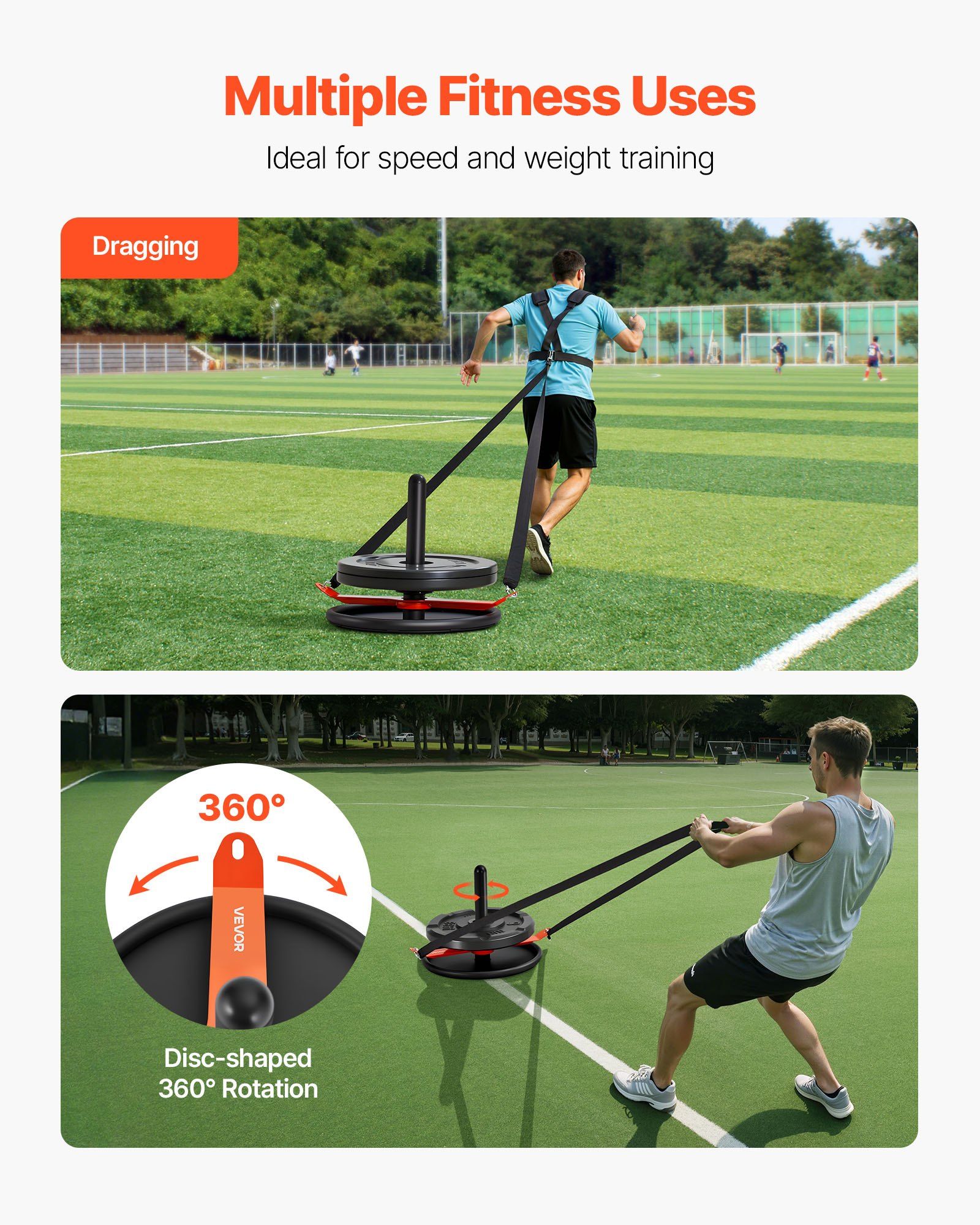 Train strength, speed, and agility with this 360° rotating weight sled. Heavy-duty steel, padded harness, dual pull hooks, and Olympic plate compatibility.